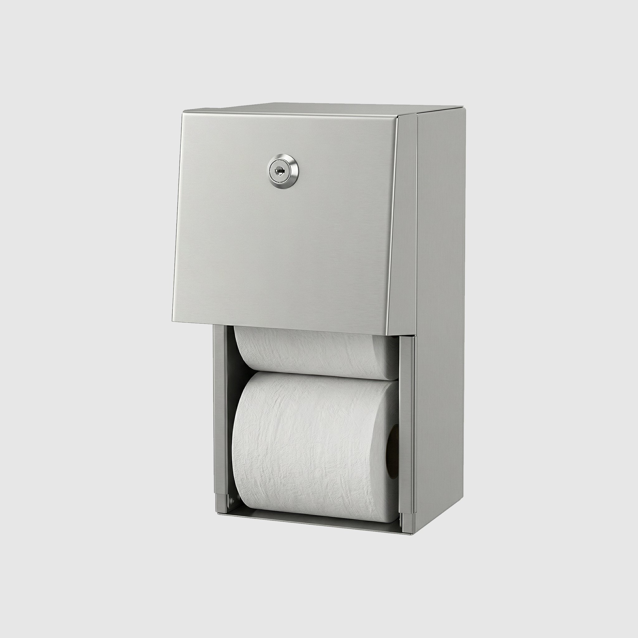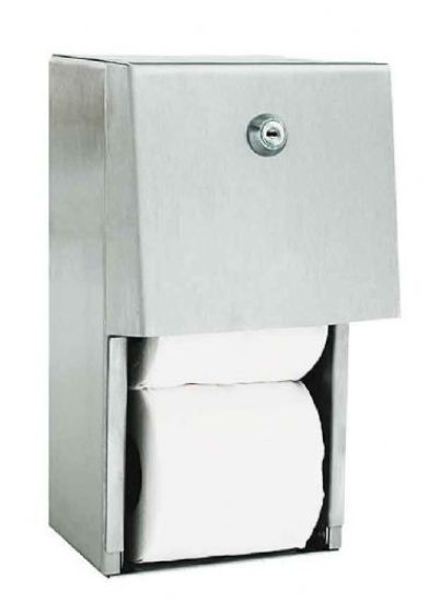 Антивандальный диспенсер для двух рулонов туалетной бумаги на 50 метров выполнен из нержавеющей стали и имеет замок с универсальным ключом