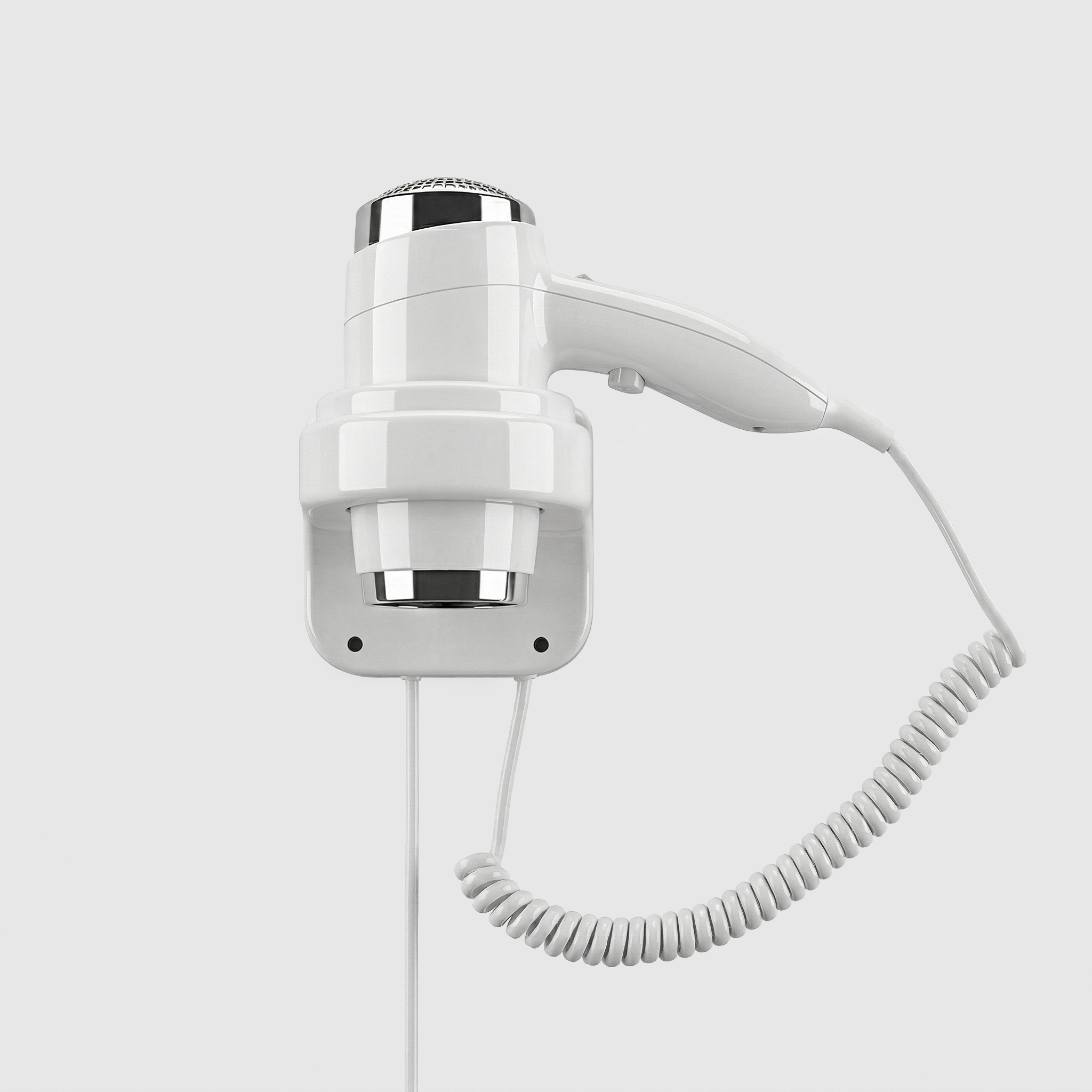 Фен настенный белый 1800-2200 W. Корпус из белого ABS пластика. Оборудован мощным двигателем до 2200W. Имеет 2 режима работы. Устройство крепится к стене с помощью 3 болтов крепления, которые поставляются в комплекте с устройством. Белый пластик глянцевого типа делает фен очень привлекательным и практичным в использовании.