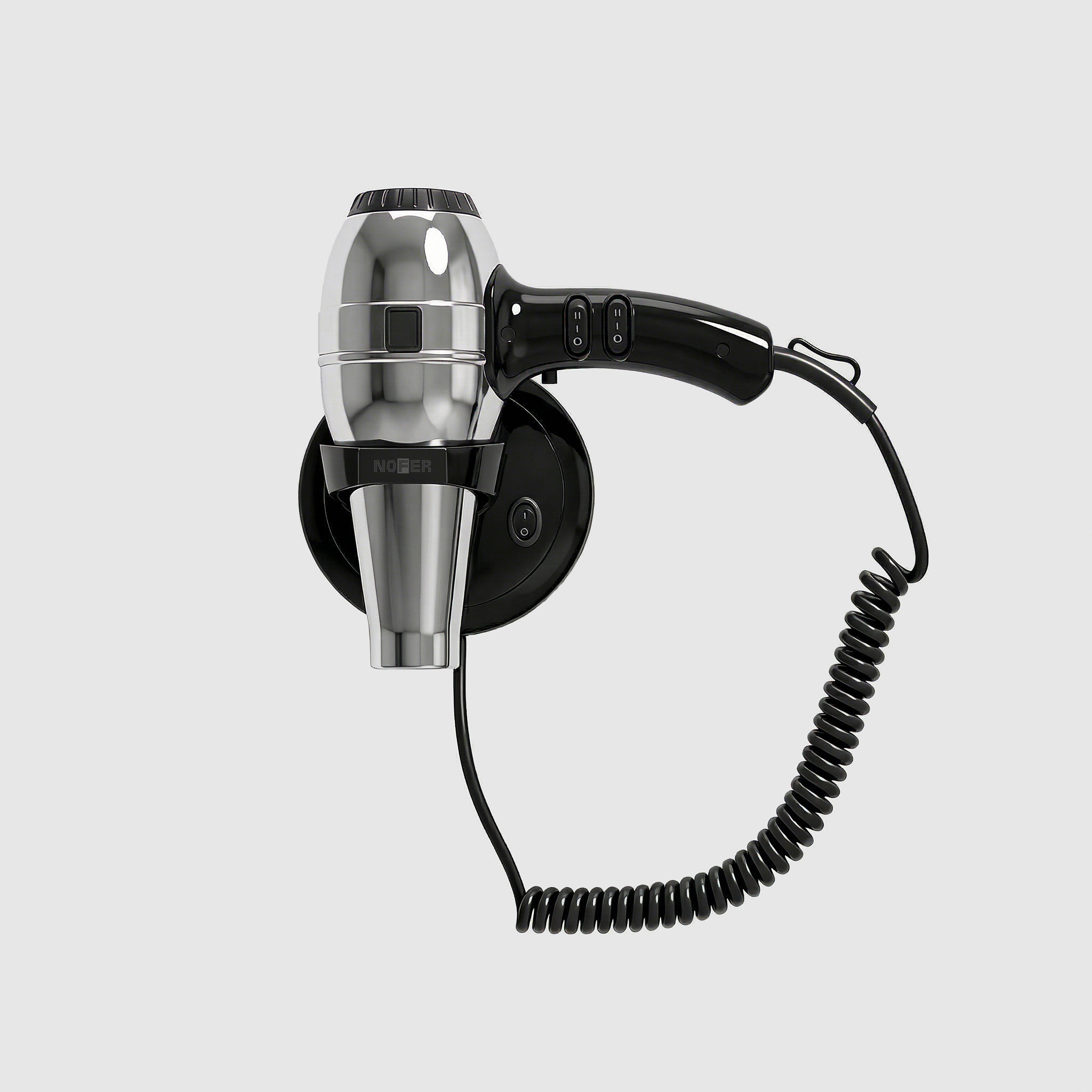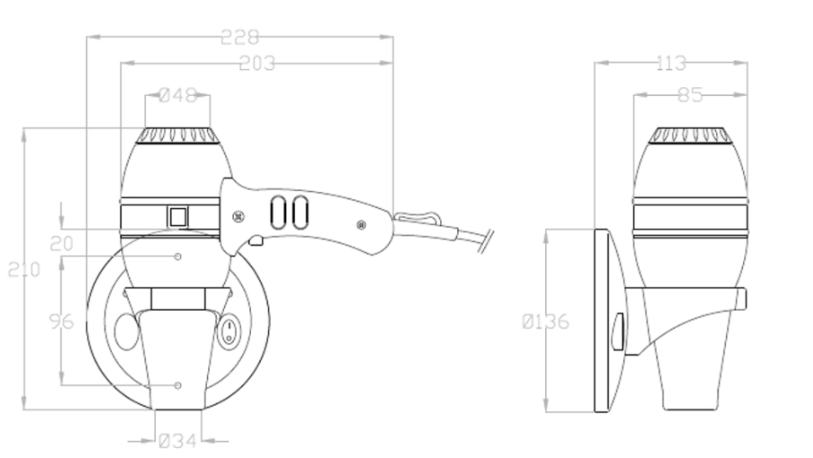 Профессиональный фен для волос пистолетного типа. Настенный кронштейн. Данный аппарат имеет 2 режима которые регулирует скорости потока воздуха и 2 режима регулировки температуры воздуха. . Корпус фена выполнен из ABS пластика и хромированной стали. Прекрасно подойдёт для гостиниц, отелей и салонов красоты