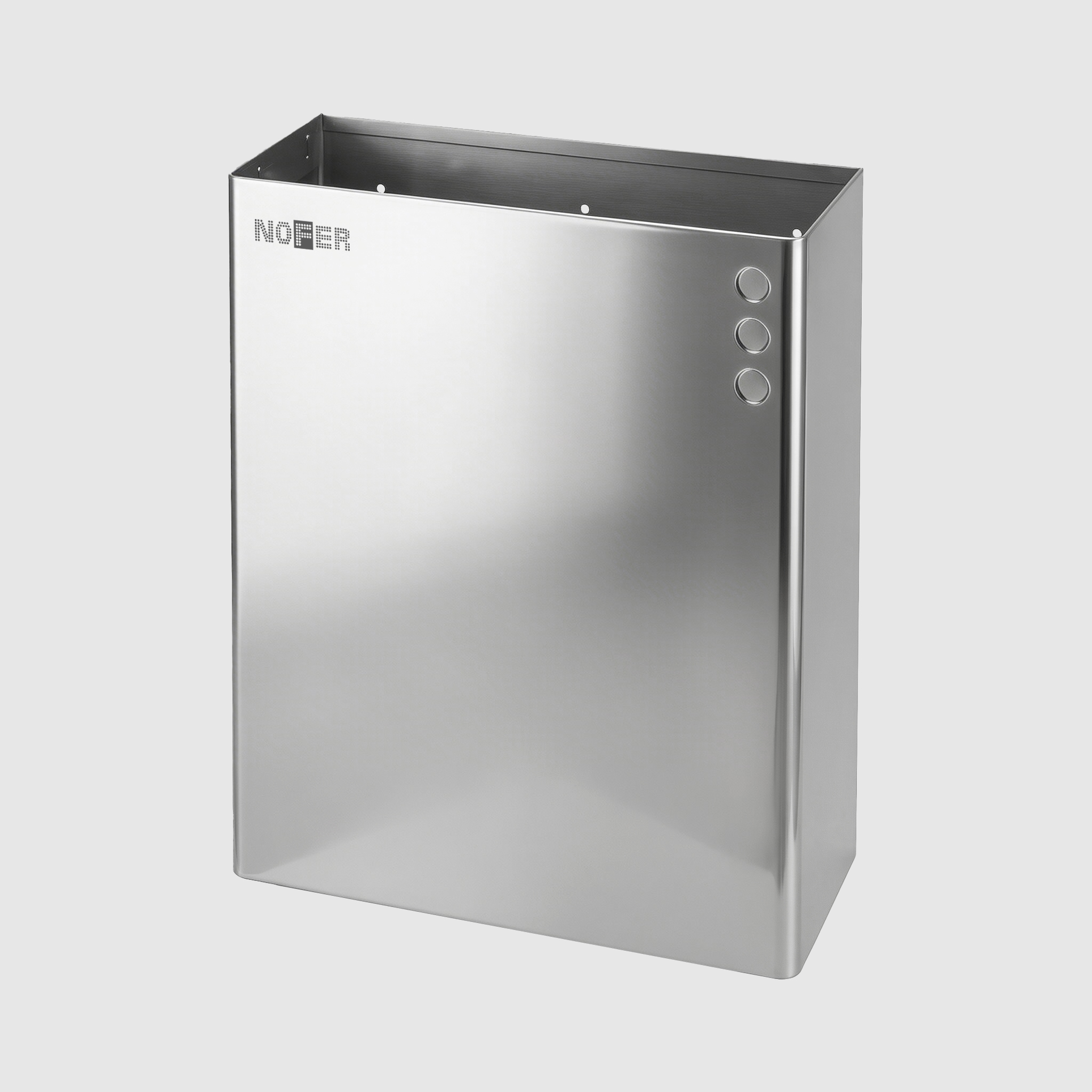 Настенный контейнер для мусора Nofer 14077.В выполнена из нержавеющей стали AISI 304 и может быть монтирован как на пол, как и на стену, имеются крючки для полиэтиленовых пакетов. Корпус контейнера не имеет острых углов, а стенки корпуса имеют толщину 1,0 мм, благодаря этим качествам контейнер настенный считается антивандальным. Ёмкость для мусора настенная имеет глянцевый оттенок.