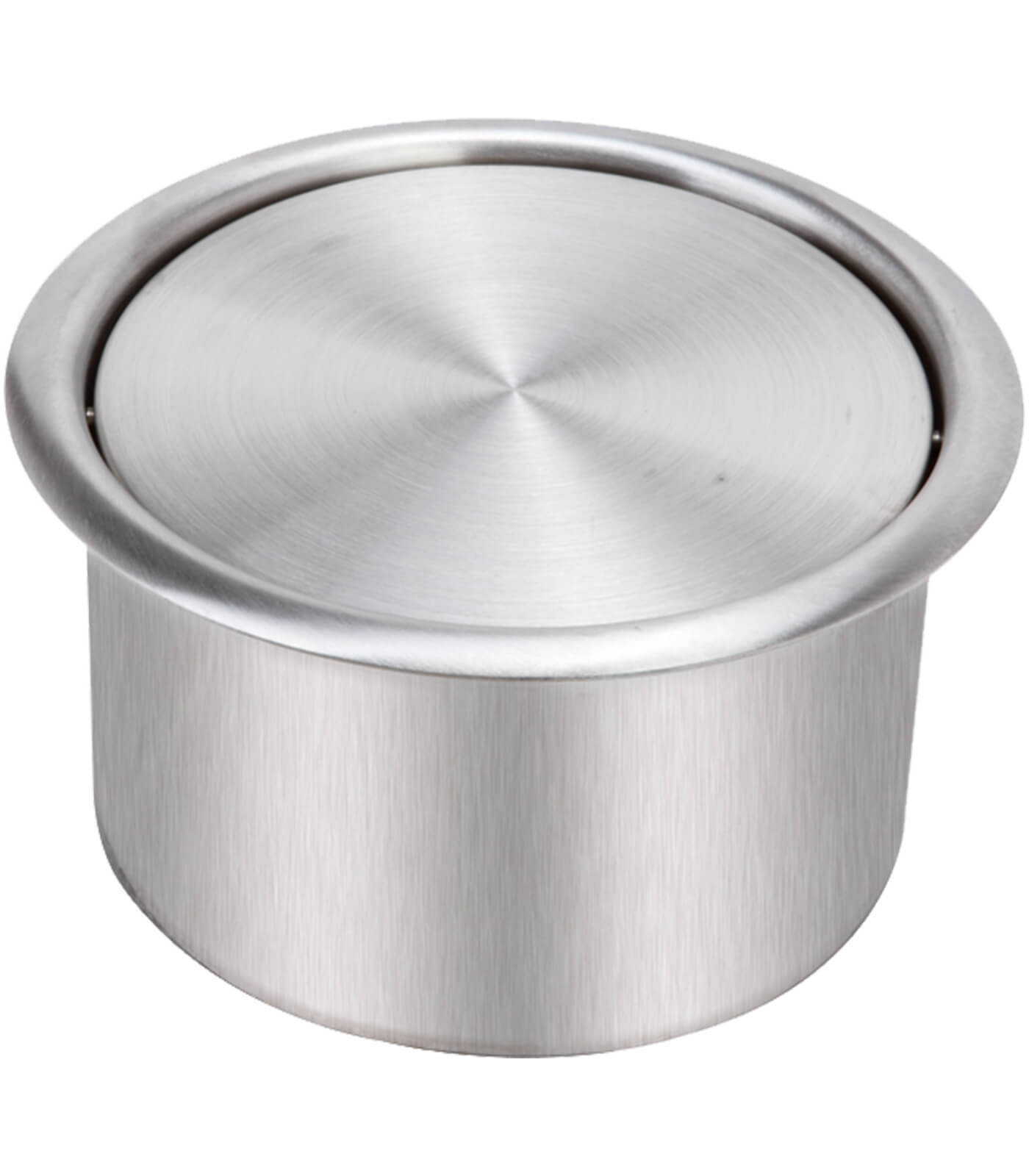 Кольцо для установки в столешницу для мусорной корзины с крышкой из нержавеющей стали,матовой отделки. ∙ С полированными краями для безопасного использования. ∙ Прочность и устойчивость к коррозии. КОМПОНЕНТЫ И ТЕХНИЧЕСКИЕ ХАРАКТЕРИСТИКИ ∙ Изготовлен из сатинированной нержавеющей стали с крышкой. ∙ Размеры: высота 90 мм диаметр отверстия Ø140 мм. ∙ Диаметр с бортом: Ø170 мм.