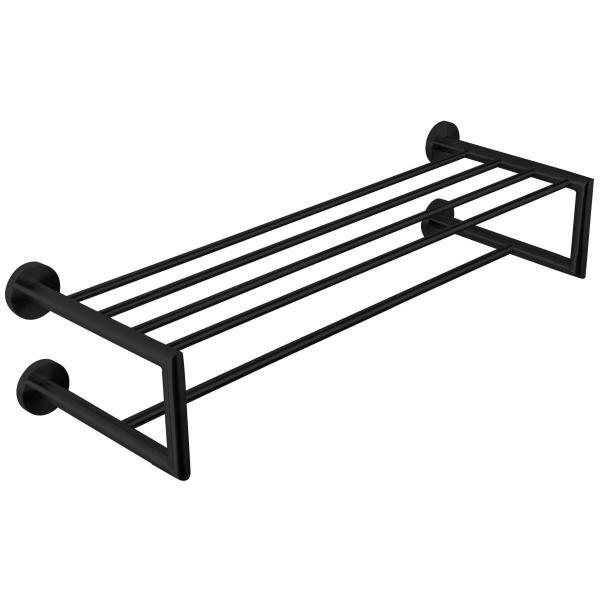Полка для полотенец с вешалом NIZA черная 16854.N. Выполнена из нержавеющей стали AISI 304. Подходит для мест с большой проходимостью. Мы ремендуем проводить регулярную чистку изделия, для восстановления слоя хрома, это позволит вам продлить срок службы. Крепежи входят в комплект поставки.
