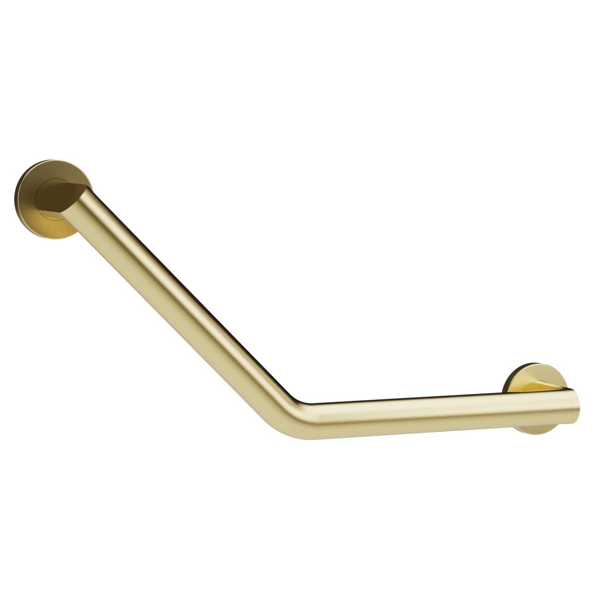 Угловой дизайнерский поручень с двумя точками опоры выполнен из нержавеющей стали с PVD покрытием в золотом матовом цвете. Поручень идеально подойдет для комплектации практически любого санузла благодаря его надежности и прочности. Внешний вид и варианты отделки позволяют использовать его в различных интерьерах.
