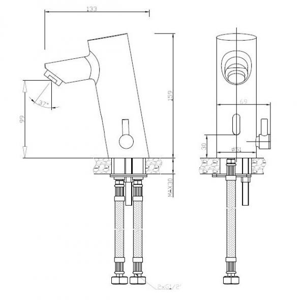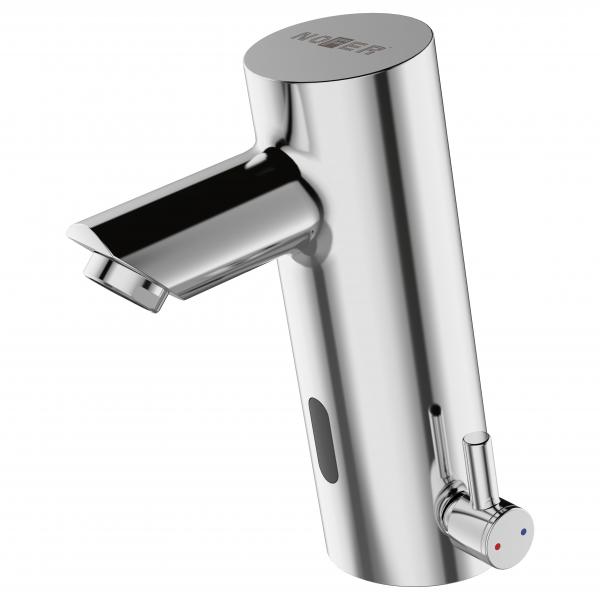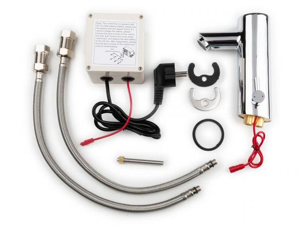 Автоматический смеситель для умывальника Установка на столешницу с автоматической системой активации через встроенный в нее инфракрасный датчик Кран работает от 4 батареек АА, которые обеспечивают напряжение 6 В, или может быть подключен к электрической сети с помощью модуля ( включен в комплект) (220 В, 50/60 Гц). Расход 6 л / мин при давлении 3 бара Материал: хромированная латунь CW617N Размеры: 159 высота x 69 ширина x 133 глубина (мм)