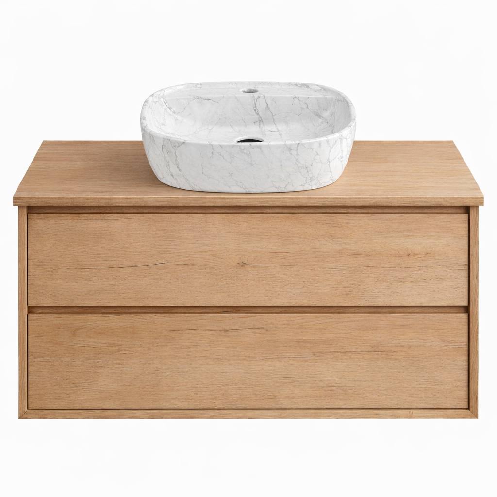Тумба под раковину COOL с 2 выдвижными ящиками 100x45 x54 CL.100.MUD орех+Столешница накладная на тумбу для раковины-чаши FLAT 101x46 EP101.M орех+Раковина накладная овальная, с полочкой для смесителя 405x405x120 мм SPIN 40 CG.23597 мрамор белый