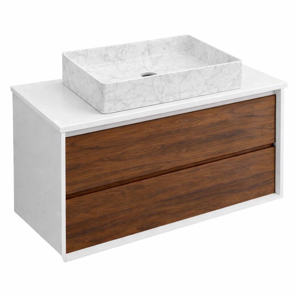 Тумба под раковину COOL с 2 выдвижными ящиками 100x45x54 CL.100.WNOGAL белый/орех+Столешница накладная на тумбу для раковины-чаши FLAT 101x46 EP101.W белый+Раковина накладная прямоугольная 470x360x110 мм QTRO47 23583 мрамор белый