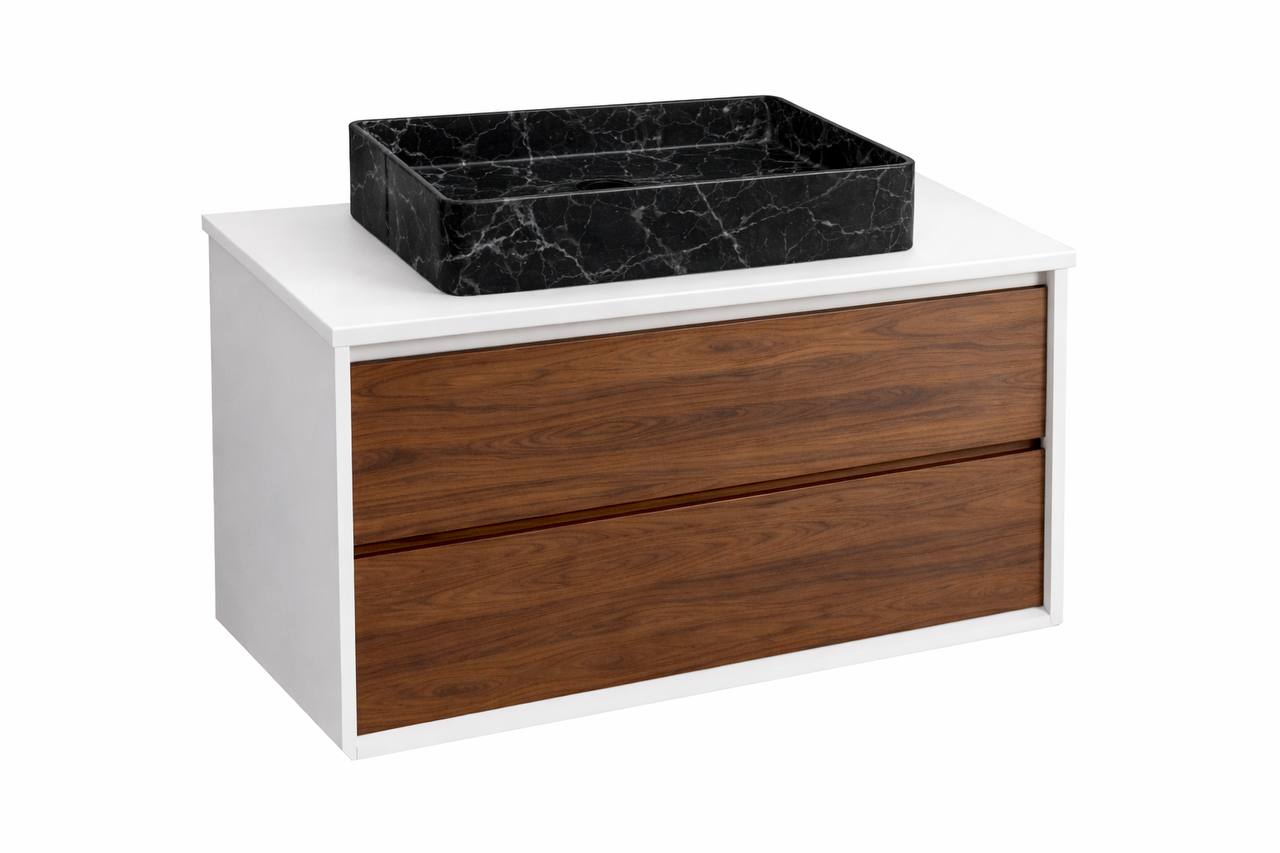 Тумба под раковину COOL с 2 выдвижными ящиками 80х45х54 CL.080.WNOGAL белый/орех+Столешница накладная на тумбу для раковины-чаши FLAT 81x46 EP081.W белый+Раковина накладная прямоугольная 470x360x110 мм QTRO47 23584 мрамор чёрный