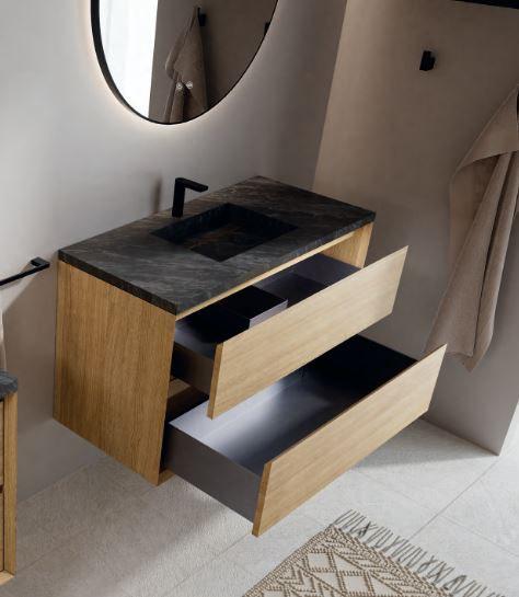 Подвесная тумба под раковину NOFER серии F5 коллекции COOL выполнена из высококачественной влагостойкой фанеры. Тумба изготовлена из доски толщиной 19 мм. Внутренняя отделка тумбы и ящиков цвет антрацит. Ультратонкие металлические ящики 2 мм, системой бесшумного, плавного закрывания. Верхний ящик высотой 12 см. с углублением для сифона. Нижний ящик высотой 15 см. Система для монтажа тумбы в комплекте.