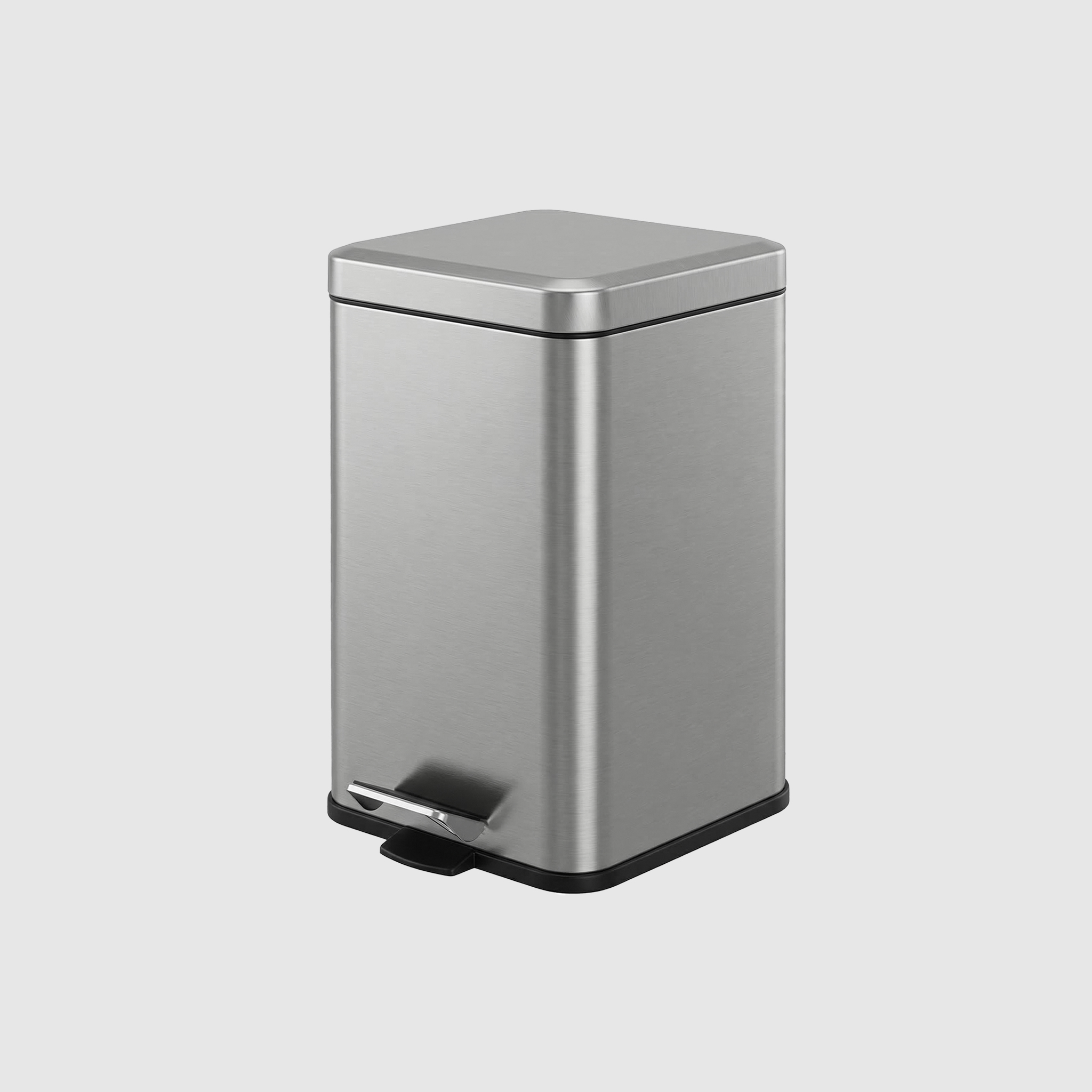 Контейнер для мусора с педалью среднего объема на 6 литров имеет корпус из нержавеющей стали AISI 304 матового оттенка, а также внутренний бак, для удобства пользователя. Ведро оснащено педалью, с помощью которой открывается крышка и приподнимается внутренний контейнер. Форма ведра прямоугольная.
